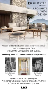 We invite you to an intimate book signing and Q&A for the release of Jenny Garrigues: A Romance with Design: My Love for Beauty, Art, Travel & Culture with the inimitable Jenny Garrigues and Beth Buckley, publisher and founder of benton buckley books.